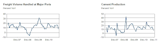 To give him an indication of the state of domestic activity, Alistair took a look at cement production widely regarded as a key feeder for the nation’s property sector, which itself is a key component for investment and the wider economy. What he found was that cement production growth slid to 7% y/y in December (see chart above), down from 11% in November and 17% in October. T