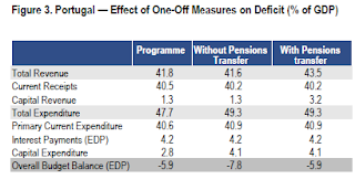 In their second review of the programme (published in December) the IMF said the following: “Staff questions both the timing of the transfer and the appropriateness of in effect using an accounting technique to mask the true fiscal position”. That is to say the Fund has a double role here – to talk the efforts of the Portuguese administration up before the world’s press, and to try and keep the politicians in line in the background.