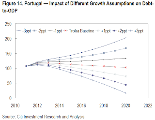 So the 2012 deficit objective is challenging, and the risks to the debt path are not negligible, but the main issue determining where Portugal goes from here is not whether or not the country will be able to go back to the markets at the end of next year, but whether or not the country’s economy is able to make the growth leap assumed in the IMF debt forecasts.