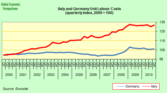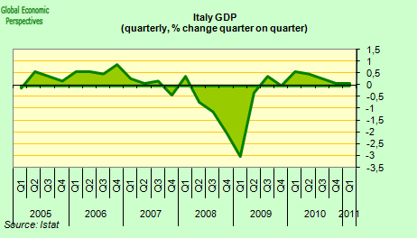 In this sense, given its size, Italy is in a key position to tip the balance between core and periphery one way or the other. And the fact that, growth in the Italian economy seems once more to be grinding to a halt is not good news in this sense, with the quarterly gowth rate falling back from a quarterly 0.6% in Q2 2010, 0.5% in Q3, 0.1% in Q4 and 0.1% again in Q1 2011.