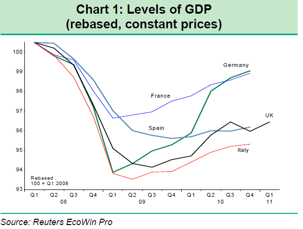 The most recent results mean that German GDP has now passed its pre-crisis peak, while Italian GDP is still stuck at the level it reached at the end of 2004. The chart below (which comes from a recent report by BNP Paribas economist Ken Wattret ) shows the path of constant price GDP in the four largest eurozone countries (plus the UK) relative to where they were in Q1 2008. France is in a similar position to Germany, since fourth quarter 2010 GDP was around 1.6% lower than its pre-crisis peak, and it just rose by 1%.