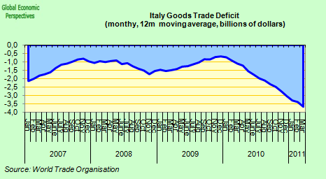 But is a 4% growth in nominal GDP realistic for the rest of this decade? It is important to remember that the composition of the earlier 4% average annual growth, since only around 1% of it came from real GDP growth, while 3% came from inflation. And, of course, during this time, as we have seen, Italy lost considerable competitiveness with Germany. So what may help with one thing (debt to GDP) may be positively harmful to another (international competitiveness, the current account defecit). As Goldman Sachs economist Kevin Daly put it in a recent report: