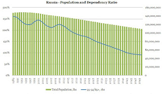 On the latter however, I am still worried that the trend in mortality have not been reversed and that, if anything, the situation is improving all too slowly. I am open to a more positive spin, but the data and an, admittedly scant, look at the evidence gives little comfort. As a result, ageing in Russia will be much more acute and its effect will have a much larger and negative impact than if life expectancy was a steadily increasing function of time. Indeed, given the continuing poor state of especially male health in Russia it is questionable whether the measures above of "peak growth" apply at all.