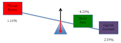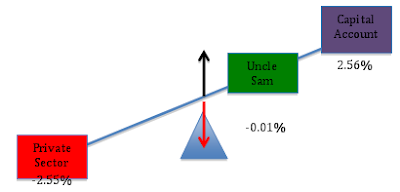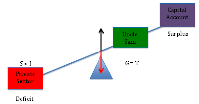 To see this in the context of the teeter-totter model, let’s initially hold the public sector’s balance constant at zero (i.e. let’s assume the government is balancing its budget so that G = T). With the government budget in balance, Uncle Sam is a “weightless” entity on the teeter-totter, so that the private sector’s financial position will simply reflect the “weight” of the capital account. Suppose, first, that the current account is in surplus (i.e. the capital account shows an equivalent deficit):