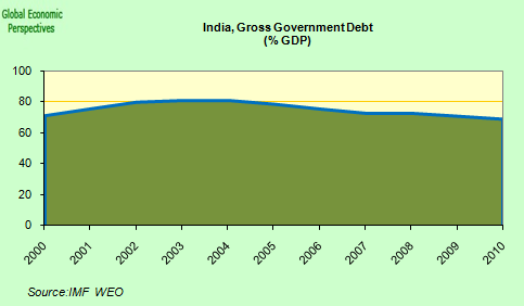 So here we have the first sign beyond the inflation that all is not entirely well in the Indian economy. If India has a trade deficit, then this means that someone somewhere is borrowing money. And indeed they are, since while private sector indebtedness in India is low (despite rising consumer credit), government debt is high, indeed it is very high by emerging economy standards.