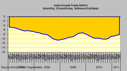 In fact India runs a trade deficit (well, someone has to). May imports surged 54.1% to $40.9 billion, touching the highest level in four years and only adding to concerns about the widening trade deficit. India’s goods trade deficit was $15 billion in May – the widest level since August 2008