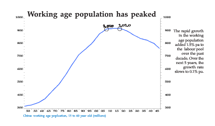 Meanwhile, as can be seen in the accompanying charts, China’s working age population is in the process of peaking both numerically and as a proportion of the total population.