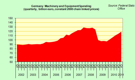 In Germany, on the other hand, we see the same pre-crisis pattern, and then the slump, but in contrast to the Spanish case, investment took off again as exports started to pick up. Germany is increasing capacity, while Spain isn’t, doesn’t that tell us something about competitiveness. It is one thing to get export prices more or less right using an old capital stock, and relatively cheaper workers (under the new contracts), and quite another matter to buy new capital and start to increase export market shares.