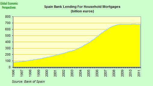 To get an idea just how difficult it would be to shift all these developer loans and turn them into sales, a contrast with the existing stock of mortgages (after all the boom years) is instructive. At the present time the Spanish banking system is financing just short of 700 billion euros in mortgages. To accommodate all the latent needs of the housing sector this number would need to go up by something like another 50%, and in a period of “rebalanced” economic activity. The argument staggeringly fails to convince.
