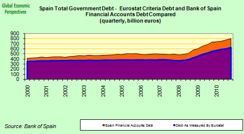 There are many factors that could condition the size of the debt to GDP ratio, the unpaid bills on regional government books (93.6 billion euros at the end of Q4 2010), the 83 billion euros given by the government in guarantees (or 7.8% of GDP, a quantity which will only be turned into debt should the guarantees need to be honoured), the debt which is languishing on the books of public sector companies (55.7 billion euros at the end of Q4 2010), the possibility that the Spanish economy have a bout of deflation at some point, etc.