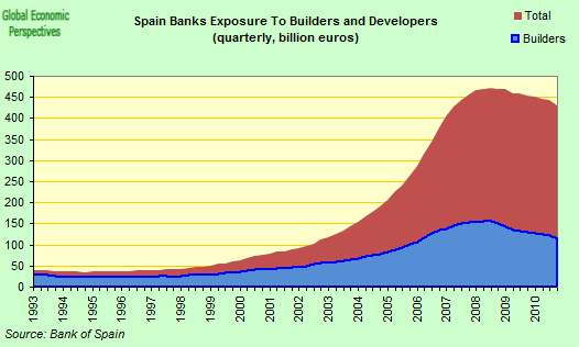 Just how unbalanced is the Spanish economy? Well look at the size of outstanding developer loans shown in the chart below, something like 320 billion euros of them. These represent houses that are either unsold, unfinished, or even as yet unstarted.