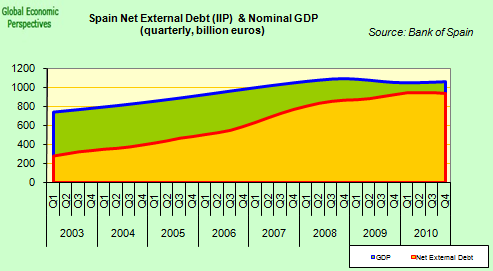 The real problem is the country risk element. As the spread on Spanish sovereign debt and bank debt rises the income account will evidently deteriorate, and this is obviously one of the major risks for the Spanish economy at this point. The more country risk rises, and the more the weight of interest payments pressurises the current account the more living standards internally need to be compressed (via austerity measures) simply to keep the country afloat. Clearly at some point or another this hits political viability limits. Also, it should be noted that while net external debt is around 90% of GDP (very problematic in and of itself), gross debt is roughly double that, and if Spain country risk (and hence the cost of financing) rises, while country risk (and hence interest rates) in key emerging markets (from a Spanish point of view) continues to fall, then the structural income balance can even deteriorate, as well as the cyclical balance.