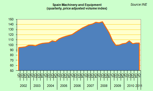 On the other hand, with exports now back near their previous peak, capacity levels must be getting strained, so Spain’s export sector should be in need of increasing investment in capital goods, shouldn’t it?As can be seen in the following chart, investment in machinery and equipment in Spain was rising steadily as exports rose in the pre-crisis period. Then the rate of investment fell by nearly 40%, and since that time the level HAS HARDLY MOVED.