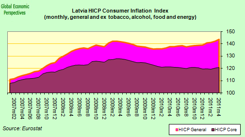 So in fact, and especially if we take as a point of reference the start of 2007, we can see that the actual price correction has been comparatively small, and indeed the position is once more deteriorating, even though output in the Latvian economy is over 20% below its pre-crisis peak. Is that really such a flexible situation?