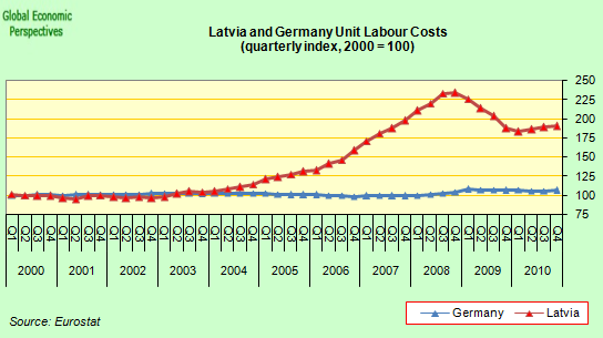 As we can see, despite having a relatively high standard of living Germany has managed to maintain unit labour costs relatively stationary over the last decade, due to rising productivity. Latvia evidently has not. This has nothing to do with being rich or poor, as can be seen from the years 2000 to 2004 Latvian living standards were rising, but they were rising in line with productivity, which is of course perfectly sustainable, and basically the pattern you want to see. Then from 2005 onwards the link was broken, and Latvian wages exploded in a way which was totally unsustainable. During 2008 and 2009 unit labour costs started to improve (in part because a lot of very unproductive workers in construction lost their jobs, the pattern in Spain is similar) but from the start of 2010 onwards the process has been in reverse gear again, and once more it is interesting to note that German labour costs (even though the economy is booming) are not following suit.