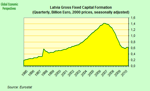 On the other hand, and before getting into the actual analysis, I want to stress that I personally am not advocating devaluation of the Lat at this point in time. Even though I still consider it a mistake not to have devalued, and an even bigger mistake on the part of the EU leadership not to have accepted the IMF proposal for immediate devaluation and Euro entry, I accept that the decision not to devalue represented the democratic will of the Latvian people (following the advice of the IMF given the EU response), and it was for precisely this reason that I declined to go to Latvia in August 2009 and speak at a meeting organised by the then governing People’s Party, since I think I was only being asked to go there to cause trouble.