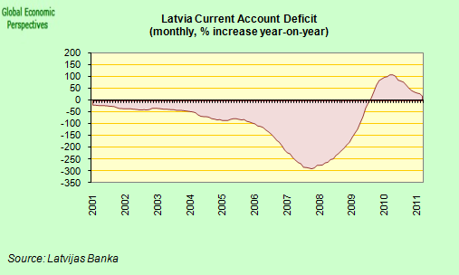Like the UK they have far too small an export sector to cope, yet both countries are looking for exports to bail them out of trouble. Yet Latvia is already losing that battle with monthly year on year increases in the current account deficit falling to just above zero, though not quite deficit yet.