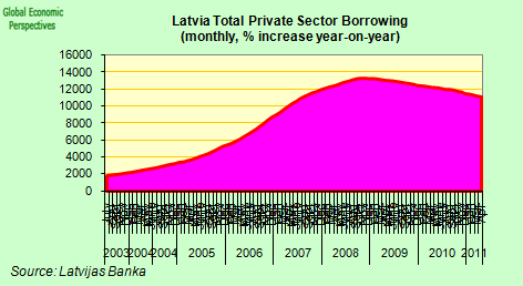 Now the Latvian economy is experiencing a sharp credit crunch, private sector credit which was increasing in 2007 at a rate of around 65% is now falling at a rate of 9% per annum.