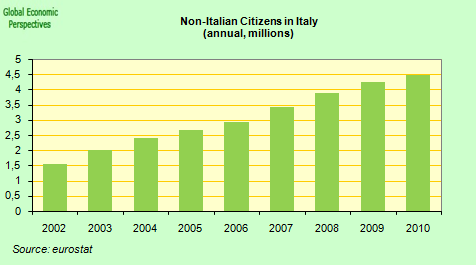 The worrying thing is how Italy has been able to get so little growth out of so much. This is especially the case when you take into account the fact that during the last decade the country’s labour force grew steadily, following the arrival of several million new migrant workers. Between 2002 and 2010 the number of non-Italian citizens officially residing in Italy was up by 3 million (or 200%).