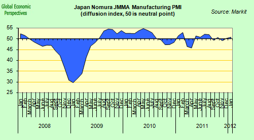 “January PMI data suggest that the sector has begun 2012 on a firmer footing following a year in which supply chain disruptions emanating from March’s earthquake and flooding in Thailand disrupted firms’ production plans. However, the survey findings paint a relatively flat growth picture, and demand for Japanese manufactured goods remains muted. Although new business and new export orders both returned to growth in January, rates of expansion were marginal. Companies cited sluggish demand from China and Europe as the principal drag on new export order growth. Some respondents also mentioned persistent yen strength, which made the cost of imported items relatively cheaper and by doing so contributed to an easing in the pace of input price inflation to a 15-month low.”