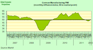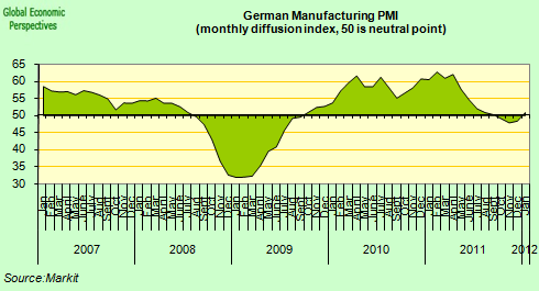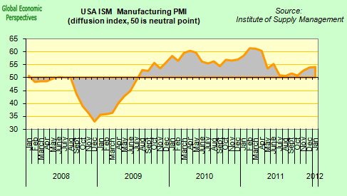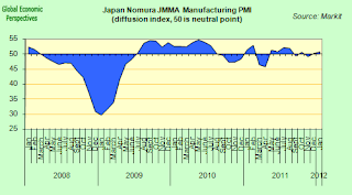 “The global manufacturing sector continued to record below trend growth at the start of 2012. At 51.2 in January, the JPMorgan Global Manufacturing PMI™ rose to a seven month high, but remained below its long-run average (51.8). Manufacturing output expanded for the second successive month in January, as new orders rose for the first time since last August”.