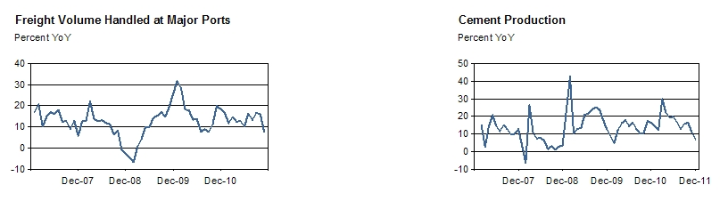 While it is important to note that micro indicators do not necessarily have macro implications, they can help shed light on nascent trends, particularly when there is a modicum of scepticism about the quality of Chinese data. Taking a cue from Vice-Premier Li Keqiang, who when Party Secretary of Liaoning joked that China’s provincial GDP figures were “man-made”, we first turn to freight volumes at major coastal ports. China’s export growth has been suffering under the weight of unravelling demand in advanced economies, and growth in freight volume sagged considerably in November—down to 8% y/y from October’s 16%. This suggests lacklustre demand both overseas and, to some extent, in China, which will drag on growth going forward.