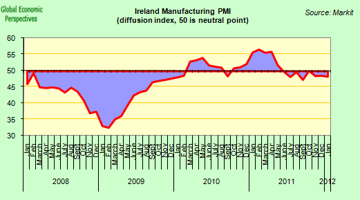 “The first NCB PMI of 2012 has got a familiar feel to it; domestic demand continues to drag and export orders continue to expand. The headline composite index contracted for the third month running (48.3 from 48.6), with output contracting more sharply than last month (47.3 from 48.7). New orders overall continued to contract (46.8), but export orders expanded once again (50.9). 2012 is going to be the fifth year in a row in which domestic demand will contract and if GDP is to expand, Ireland will need an improvement in the euro area economy in H2 2012.”