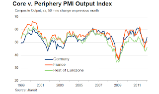 Even the German manufacturing report gave reason to be cautious. The index reading was mainly up because the current output component was up, and this component was up because backlogs of work were reduced at a faster rate despite the fact that incoming new orders declined. And why did manufacturers reduce backlogs more quickly despite falling orders? Because they feel that the debt crisis has turned the corner, and that things will now improve. Despite the evident positive contribution made by the ECB 3yr LTRO they may well still be in for a rude awakening.