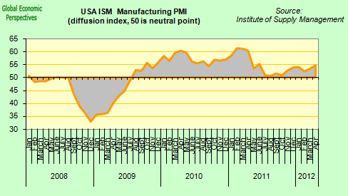 Overall output, new orders and employment all continued to rise during the month, but there was a marked divergence between the world’s two largest industrial regions, the US and the Eurozone. In fact, the US remained one of the principal spurs of global manufacturing growth in April, with the US PMI rising to a ten-month high, provoking indirectly yet more debate about the desirability of austerity across the EU. Nonetheless, as can be seen from the chart, the surge in manufacturing output remains modest when compared with the two earlier waves, which is why I am among those who think that the arrival of some sort of QE3 is now only a matter of time.