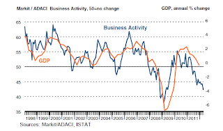 Which is why Angela Merkel’s approach was always far too simplistic. As I have said a number of times, I think she he right to search for some sort of financial stability in the face of the ageing population issue, but the best way to get from here to there is not necessarily to walk in a straight line. Naturally, austerity is a relative concept, but whether you are cutting your deficit from 10% to 9%, or from 3% to 2% as you go into a recession you still hit short term growth with a double whammy, as Italy is currently discovering. As can be seen in the chart below (which is the April Italian services PMI) domestic demand is plummeting on the back of the latest round of austerity, and this is leading the main centre left party in the government to at least cry ouch!