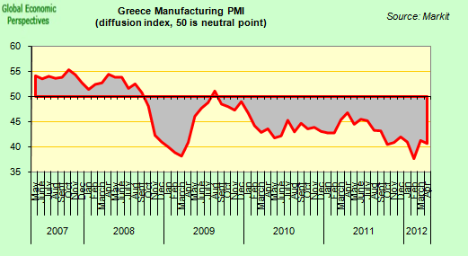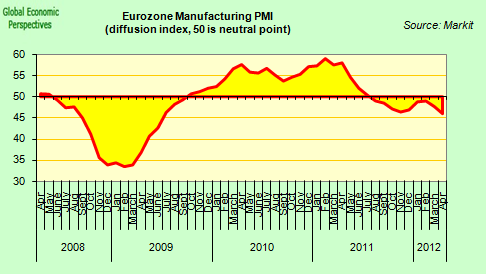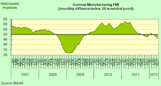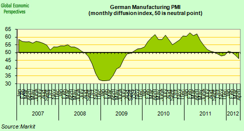“Germany started the second quarter of 2012 with its worst manufacturing performance for almost three years, as another month of weaker order inflows finally brought production levels back into contraction. With backlogs of work failing to support output volumes in April, manufacturers cut their staffing numbers for the first time since March 2010.