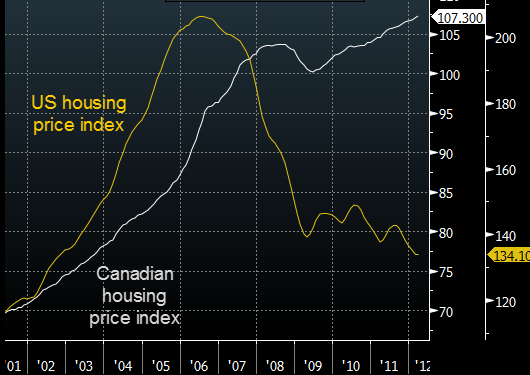 Canada has a huge bubble in housing. The slight difference in unemployment is not enough to justify the price difference compared to the US. The real question should be could its banks cope with the bursting of such a bubble?