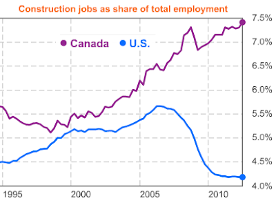 In addition, construction in Canada is booming. The chart below compares construction jobs as a percentage of total jobs for the US and for Canada. The divergence is quite striking.