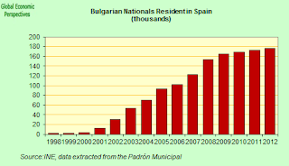 Figures on declared emigration show an increase from 19 000 in 2009 to 27 700 in 2010. However, actual outflows are considered to be much greater, based on immigration statistics of th e main destination countries. Spain, the most important destination country in recent years, recorded 10 400 Bulgarians entering in 2010, 7% more than in 2009. Outflows of Bulgarian citizens from Spain also increased in 2010, to 7 600 from almost 5 000 in the previous year (+52%). The number of Bulgarians in Spain increased by 14 500 in 2010, and a further 13 000 in 2011. There are no consistent data for Greece, the second main destination of Bulgarian immigrants in recent years, but it seems that the stock increased less in 2010 than in previous years.