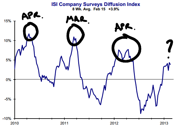 But nowhere else is the cyclical pattern more visible than in the ISI’s company survey (discussed here). In particular, the diffusion index is now once again pointing to expansion in the US corporate sector. But spring is fast approaching…