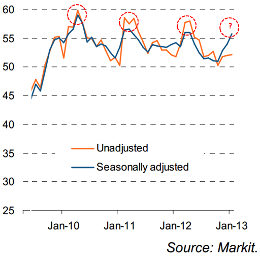 This pattern is not confined to NY state, and is in fact also visible at the national level. Within the next few days we should see the result from Markit US PMI for February, giving us a better feel for the trend in US manufacturing. So far however, the cycle remains intact.