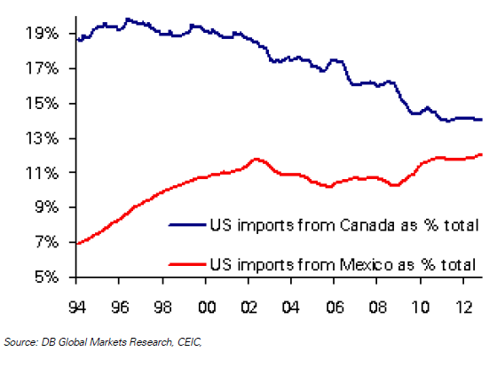 Mexico, with its cheaper labor and a growing manufacturing base, is increasingly taking Canada’s export share into the US.