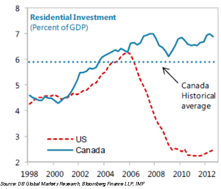 As discussed before (see post), Canada’s housing market may be facing some headwinds going forward. Valuations have materially outpaced those in the US. There is a great deal of debate on this topic, but it’s quite clear that Canadians have been pumping significant capital (materially higher than 6% of GDP) into residential housing over the recent years – even as the US housing expenditures collapsed.