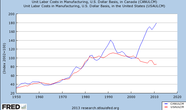 Canadian unit labor costs: blue, US unit labor costs: red