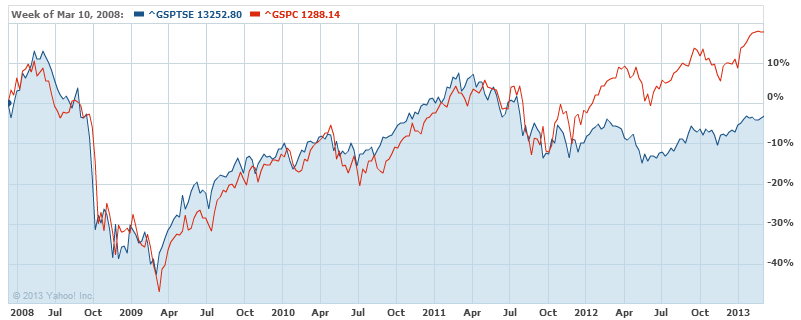 S&P/TSX (Canada): blue, S&P500 (US): red