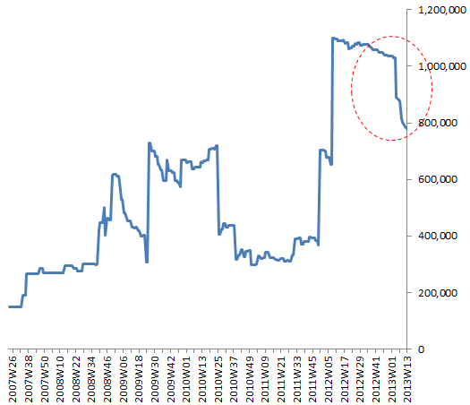 LTRO balances in the Eurosystem (unit = €1mil; source: ECB)