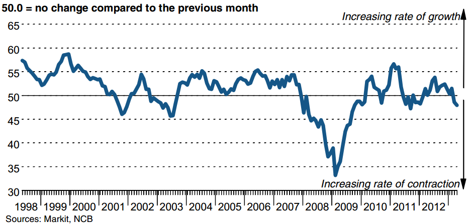 In order to raise domestic demand, the unemployment needs to fall from its stubbornly high level of 14% and the banking system needs to heal. As the manufacturing sector struggles and Ireland’s banks continue to undergo rapid deleveraging (chart below), the prospects for improved domestic demand in the near term are grim. Ireland remains highly vulnerable to fluctuations in global economic growth. With the spring slowdown upon us, its financial markets can’t be immune either.