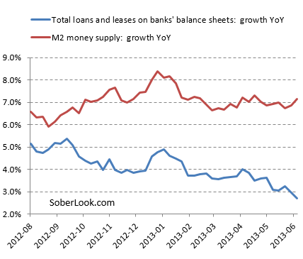 The chart below shows a clear divergence in trends of the total loans and leases on US banks’ balance sheets and the broad money supply measure (M2). Loan balance growth is slowing, while the money supply keeps growing at a steady rate of around 7%.
