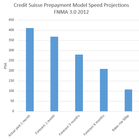 If you have a 30-year mortgage at 3.6%, it is now less likely you will refinance any time soon (mortgage rates today are above 4%). One reason your mortgage is not treated as a full-term 30-year note is the probability that you will sell your house, thus terminating the note. There is also some probability that in the future, mortgage rates will drop below 3.6% again, providing you another opportunity to refinance. The expected average life of your 3.6% mortgage and the security that is backed by your loan has therefore been extended (from you potentially refinancing in the next six months to you selling your house in say 5 years). And if rates rise further, prepayments will slow even more. The chart below shows the prepayment speed (PSA) for just such a security over the past month as well as the expected prepayment speeds going forward. It also shows what happens if rates increase by another half a percent.