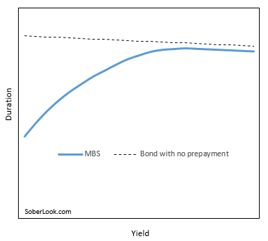 But unlike most other fixed income securities, MBS duration tends to increase with yield. That’s because higher MBS yields typically mean higher mortgage rates and lower mortgage refinancing activity (which we have already seen). Pools of mortgages backing many MBS, particularly loans with lower coupon, will experience slower prepayment speeds going forward. Slower refinancing extends the effective duration of the bonds (illustration below).