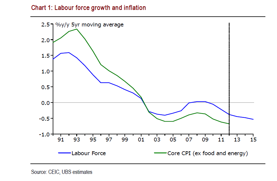 Except, except….. what about the decline in working age population (WAP)? Isn’t that the factor that many feel is behind the ongoing battle that Japan is fighting with deflation? (See, for example, this post). The Bank of Japan has long recognised that there is some sort of correlation between the rate of workforce growth and the rate of inflation (see chart below), with price inflation turning negative at more or less the same time as labour force growth did. The causality behind the correlation would be connected with the rate of rise (or decline) in domestic demand (initially consumption and then investment). Movements in WAP could be considered to be a good proxy for movements in employment and incomes, and hence consumer demand. As a country’s WAP enters decline then domestic demand tends to weaken and following this the investment which goes with such demand does not occur. This is why failure to adequately resolve the present malaise into which the Czech Republic has fallen could produce a long term negative consequence for trend growth, as the IMF have highlighted.