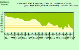 The income item is large and negative due to the country’s strong negative Net International Investment Position. Simply put non Czech nationals have more investments in the Czech Republic than Czech citizens have abroad to the tune of some 50% of GDP. In an ageing society, with a shrinking workforce this situation is simply not sustainable. Czech companies and citizens need to save more, even though this will weaken domestic demand further and make the country even more dependent on exports, and more of these savings then need to be invested abroad to generate an income flow which will help the country support its rapidly ageing population from 2020 onwards. This situation is widespread across Eastern Europe (see Hungary here and Bulgaria here).