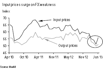 While this is expected to help companies in service export sectors (IT services, etc.), it will compress margins for other firms. Weaker currency raises input prices for firms that import parts, materials, etc. who are often not in a position to increase their output prices. The divergence between input and output prices in India is already visible.