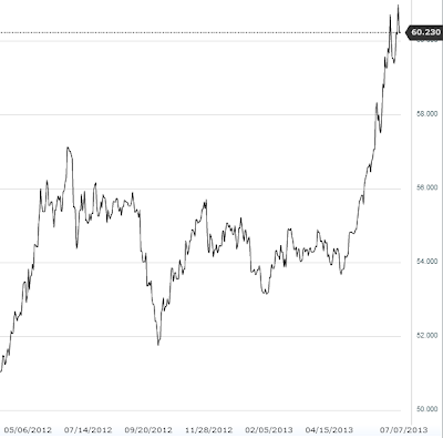 Perhaps the most troubling aspect of this rupee weakness is the chart below which shows Brent crude oil denominated in rupees. For India, oil prices currently stand at recent record highs (except possibly the oil India buys from Iran at a discount). Given that domestic petroleum is generally subsidized by the government, this spike is sure to put significant pressure on India’s fiscal balance.