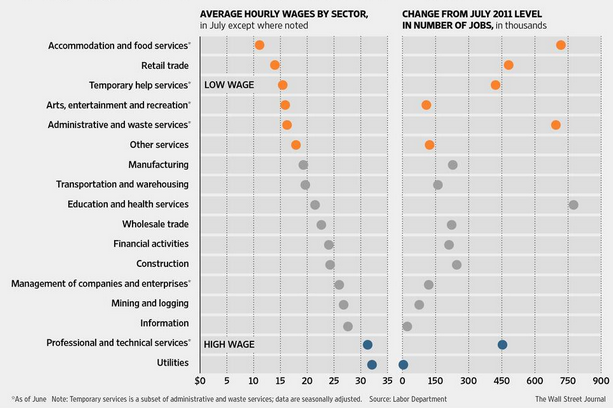 Furthermore, a good part of the US job creation over the past couple of years has been in the low wage sectors. That, combined with the part-time employment trend (above) keeps household wages from rising substantially in spite of lower unemployment figures.